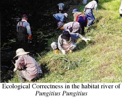 It promotes to stock artificially propagated Pungitius sp. in its habitat river by mowing grass. The river was designated by Ministry of Environment in 1989.